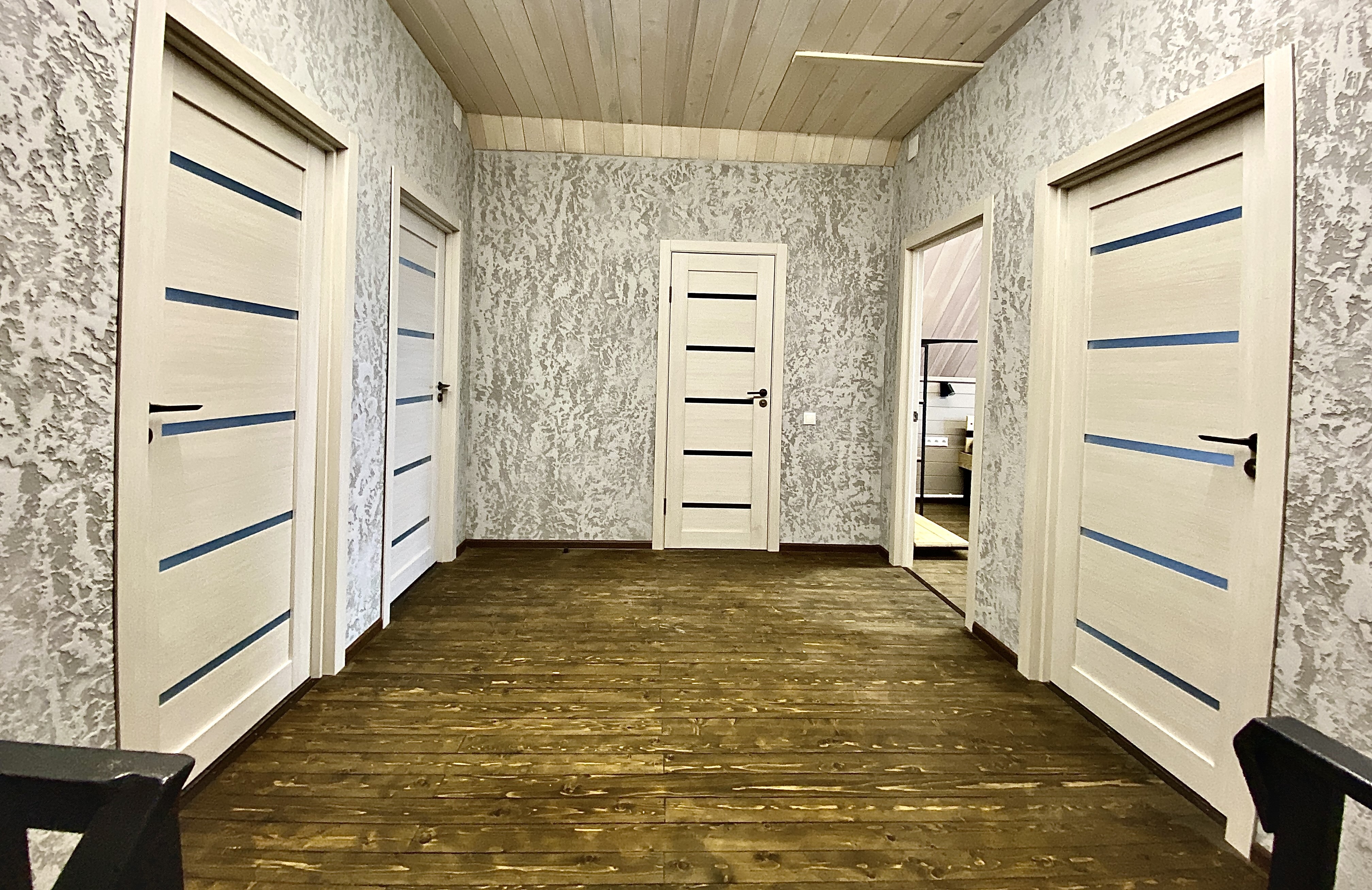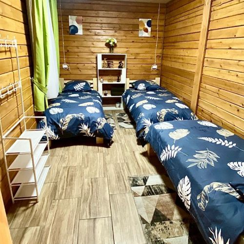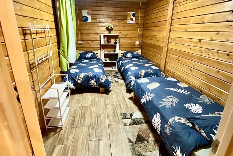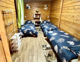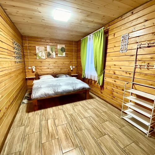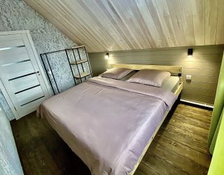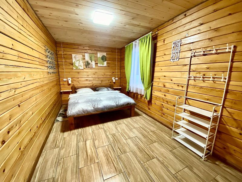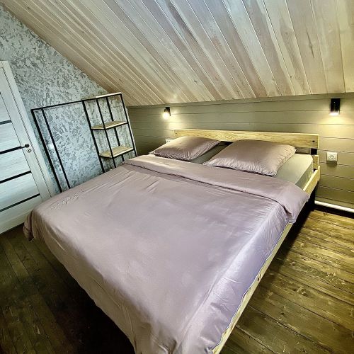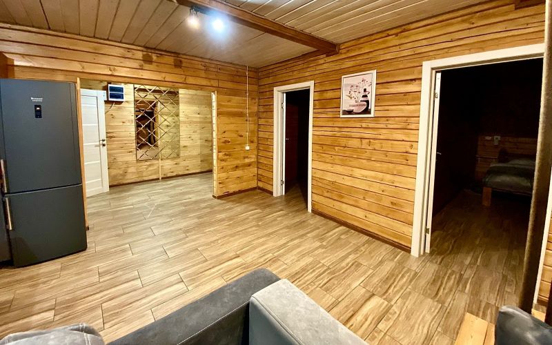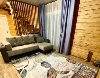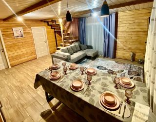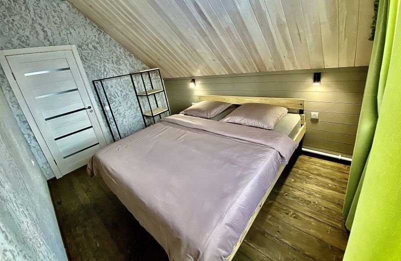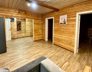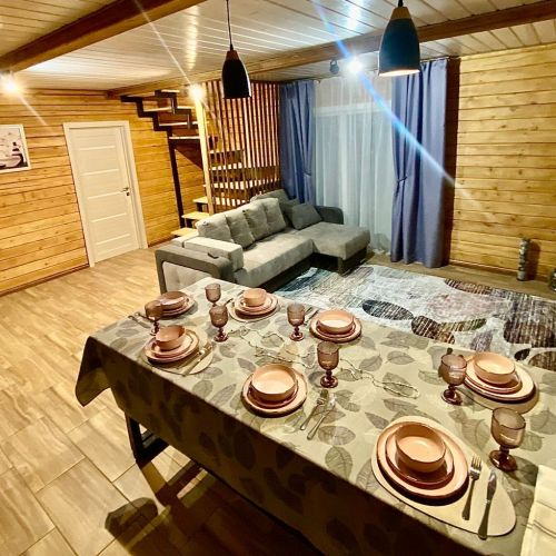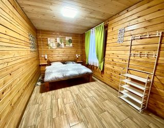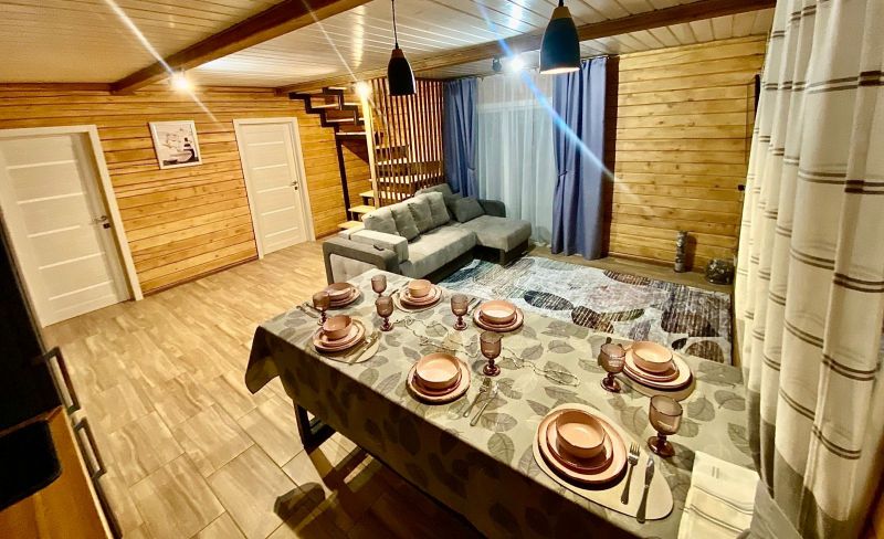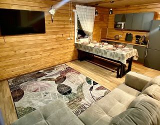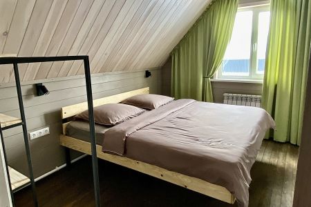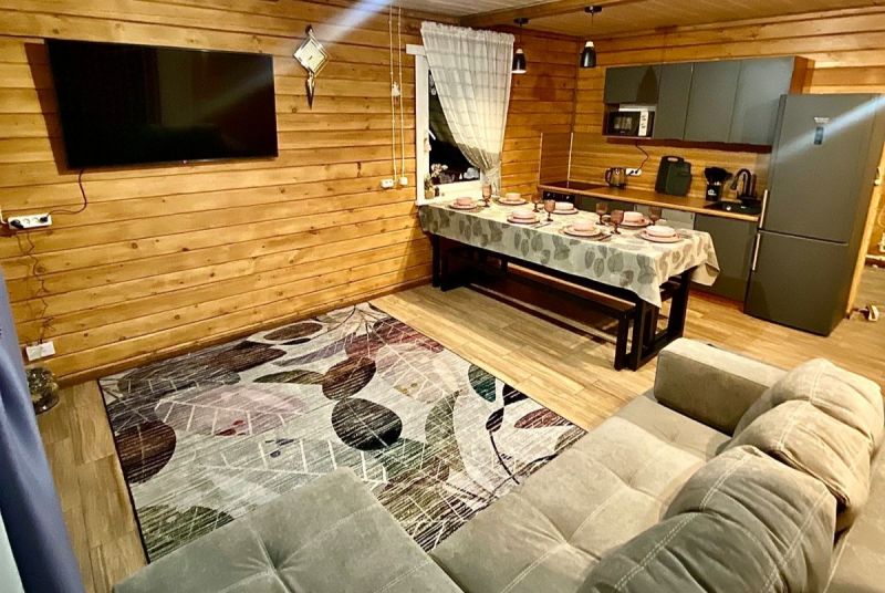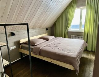Двухэтажное здание гостевого дома, выстроенное из кедрового бруса, расположено на благоустроенной территории на Рябиновой улице. Дом рассчитан на 13 человек, внутри - шесть спален, удобная гостиная и кухня. Коттедж оснащен всей современной бытовой техникой: есть микроволновка, посудомоечная машина, холодильник, ЖК-телевизор, фен, стиральная машина.